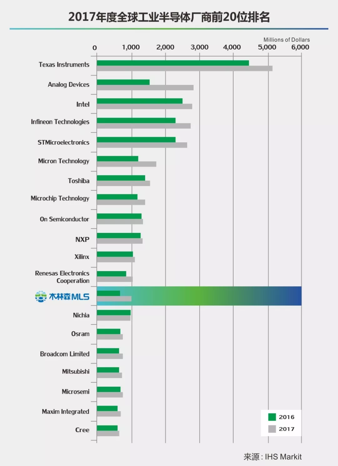 由于LED照明市場的持續(xù)強(qiáng)勁,光學(xué)半導(dǎo)體取得了IHS Markit所稱的出色表現(xiàn)。在LED照明方面,與2016年一樣,共有四家廠商登榜,分別是木林森MLS、日亞化學(xué)Nichia、歐司朗Osram和和科銳Cree,但排名發(fā)生了變化,木林森由2016年的18上升到13位,超越日亞化學(xué),是照明廠商在該榜單的最好名次。